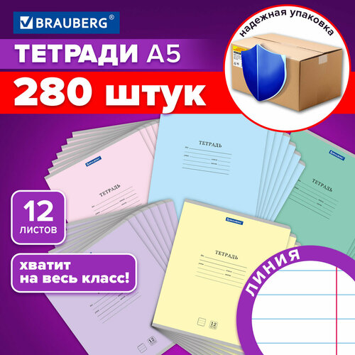 Тетради 12л. КОМПЛЕКТ 280шт BRAUBERG КЛАССИКА NEW – идеальное решение для учебы. Эти школьные тетради в пастельных цветах отличаются качественной обложкой из импортного мелованного картона. Внутренний блок плотностью 60 г/м2 из офсетной бумаги имеет линовку с полями, что делает их удобными для письма шариковыми, гелевыми и капиллярными ручками. Каждая тетрадь содержит 12 листов и надежно скреплена скрепкой, предотвращающей выпадение листов.