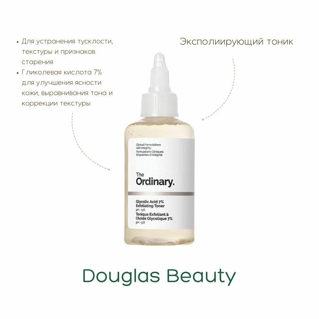 Glycolic Acid 7% Toning Solution - 7% гликолевая кислота предназначена для нежного пилинга, она регулирует работу сальных желез и выравнивает цвет лица. Формула содержит экстракт тасманского перца с целью уменьшения раздражения, связанного с использованием кислоты, а также экстракт женьшеня и алоэ вера, которые успокаивают и смягчают кожу. Косметическое средство имеет рН от 3,5 до 3,7. Не содержит спирт, силиконы или масла. Тоник веганский, во время его производства ни одно животное не пострадало.