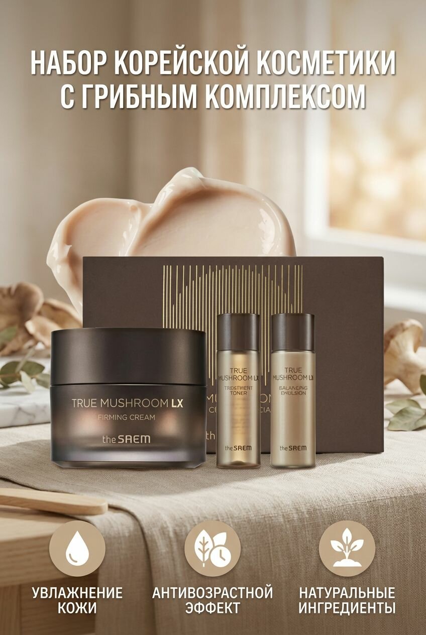 The Saem Набор уходовых средств с кремом для лица с грибным комплексом (крем/тонер/эмульсия) True Mushroom LX Firming Cream Special Set (замята упаковка)