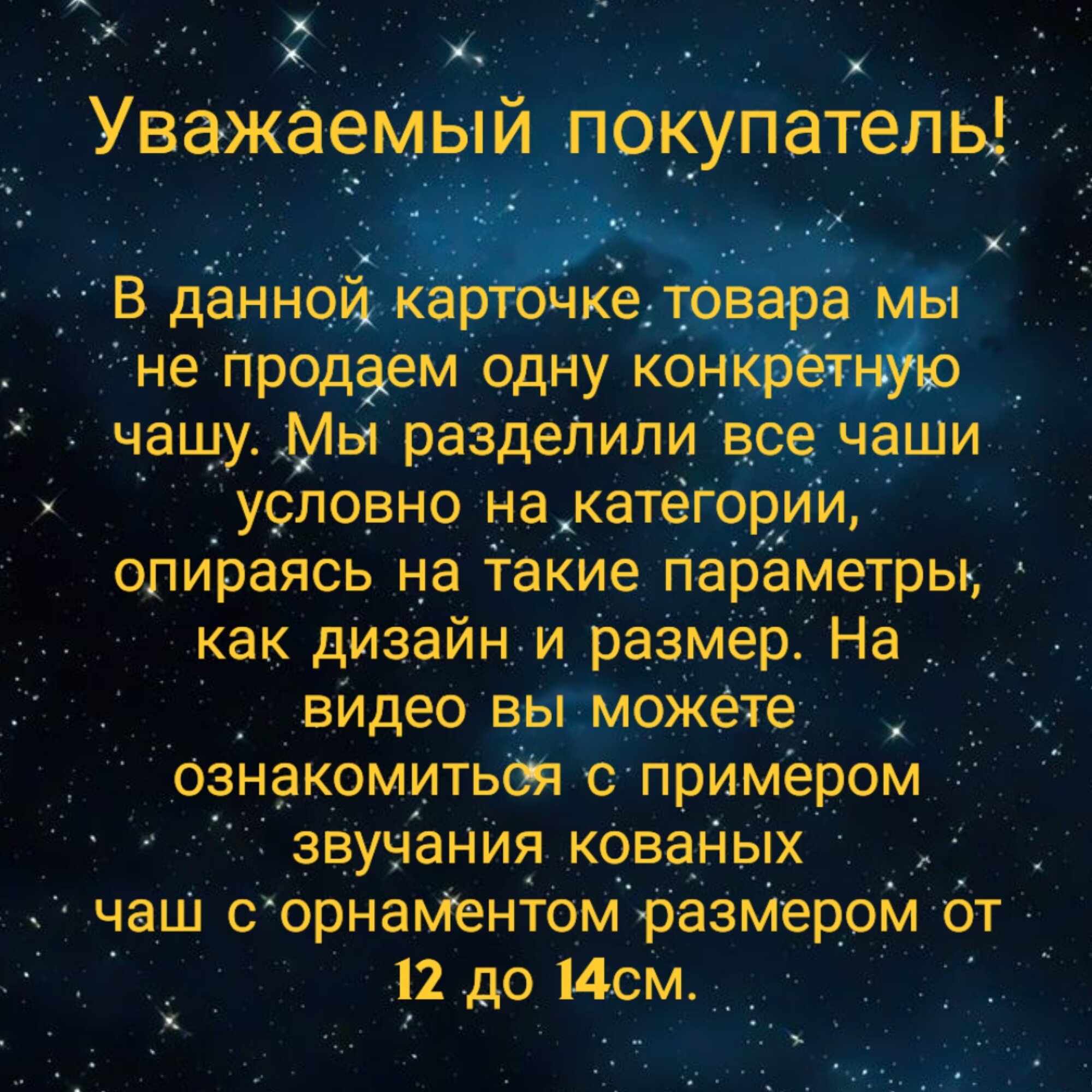Уважаемый покупатель! Мы не продаем одну конкретную чашу. Мы разделили все чаши условно на категории, опираясь на такие параметры, как дизайн и размер. На видео в данной карточке товара вы можете ознакомиться с тем, как примерно звучат кованые чаши с орнаментом размером от 12 до 14см. У чаш данной категории может различаться орнамент. Каждая чаша в нашем магазине специально выбрана из большого количества чаш. У нас нет чаш, которые не звучат. Большое количество чаш в наличии.