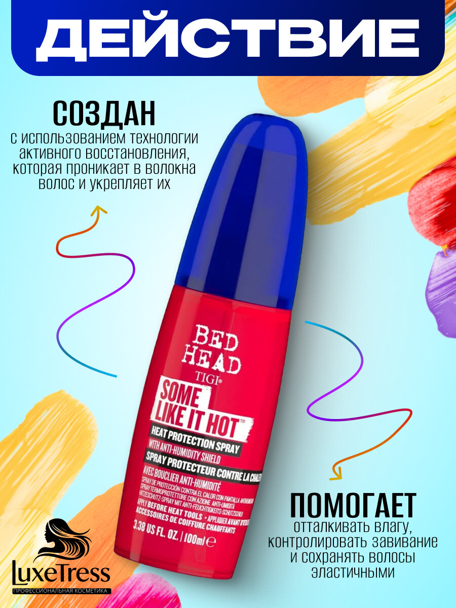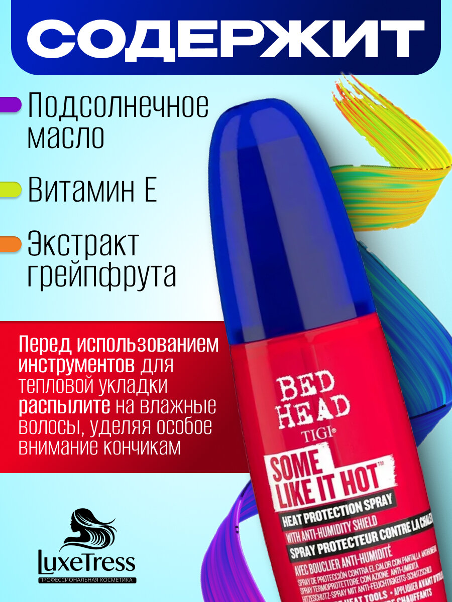 Профессиональная формула спрея для укладки волос BED HEAD SOME LIKE IT HOT идеально справляется со своей основной задачей-защитой волос от высоких температур при использовании утюжка, фена и плойки (до 230 С).