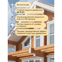 расход: 7–10 м²/л по строганной поверхности, 5–7 м²/л по пиленой поверхности древесины; время высыхания, при (20±2)°C и относительной влажности (65±5)%: 2 часа, следующий слой можно наносить через 4 часа; плотность: 1,01 - 1,05 кг/л; хранить в плотно закрытой таре при температуре не ниже +5 ºС, предохраняя от воздействия влаги, тепла и прямых солнечных лучей, гарантийный срок хранения в заводской не вскрытой упаковке - 2 года; не рекомендуется наносить на бревно и свежий брус
