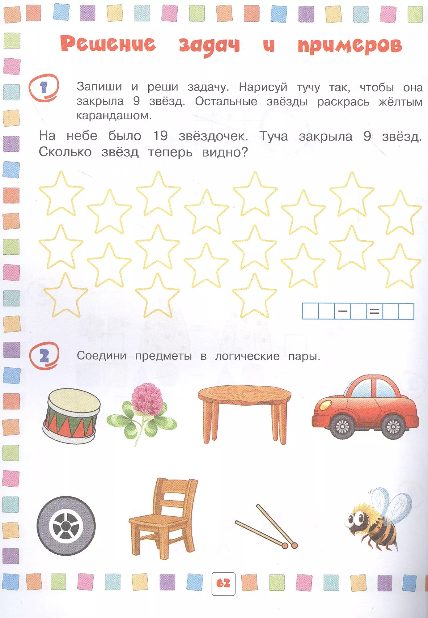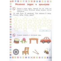 Выполняя увлекательные задания, ребёнок познакомится с понятиями "больше — меньше", "выше — ниже", "легче — тяжелее", "раньше — позже", "один — много", "столько же", научится ориентироваться на листе бумаги, правильно писать цифры и математические знаки, рисовать узоры по клеткам и выполнять графические диктанты, познакомится с составом числа, будет решать примеры и простейшие задачи на сложение и вычитание.
