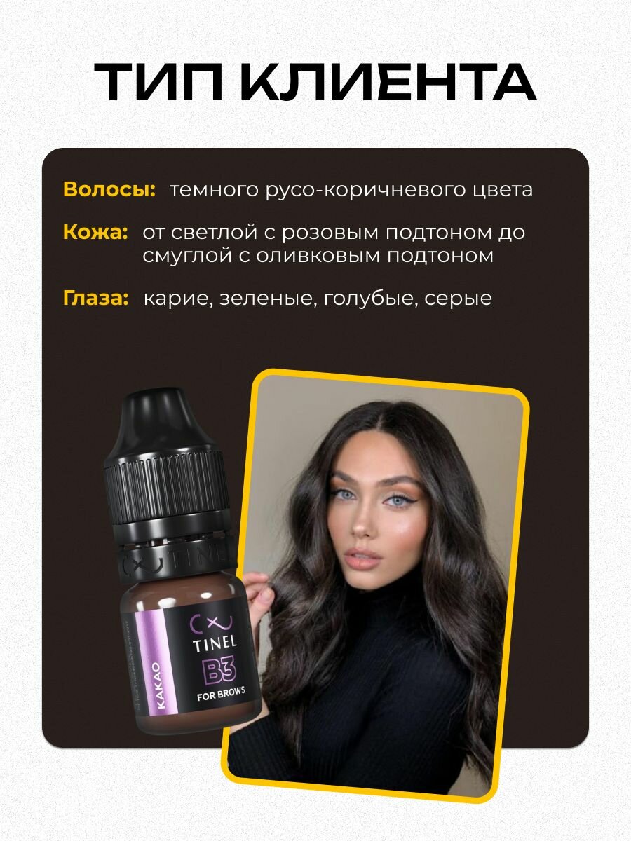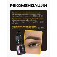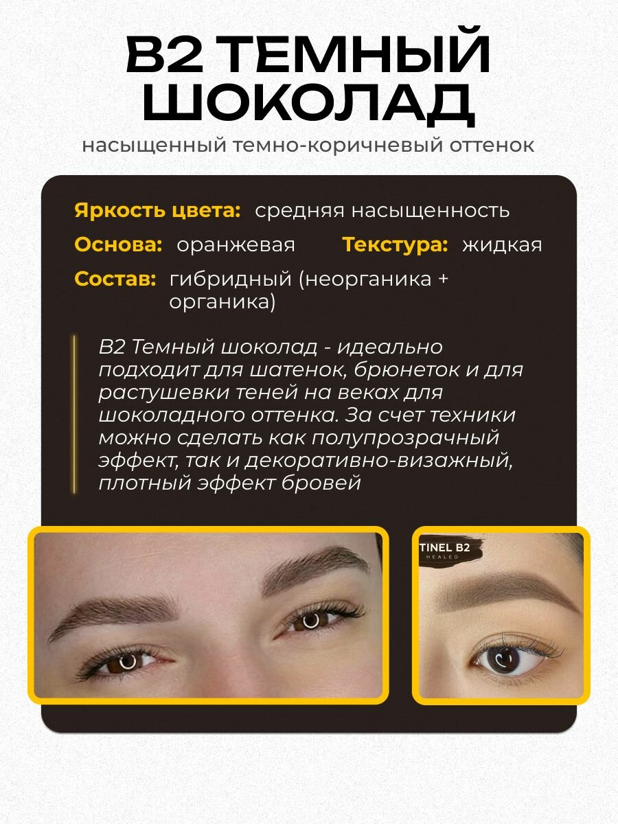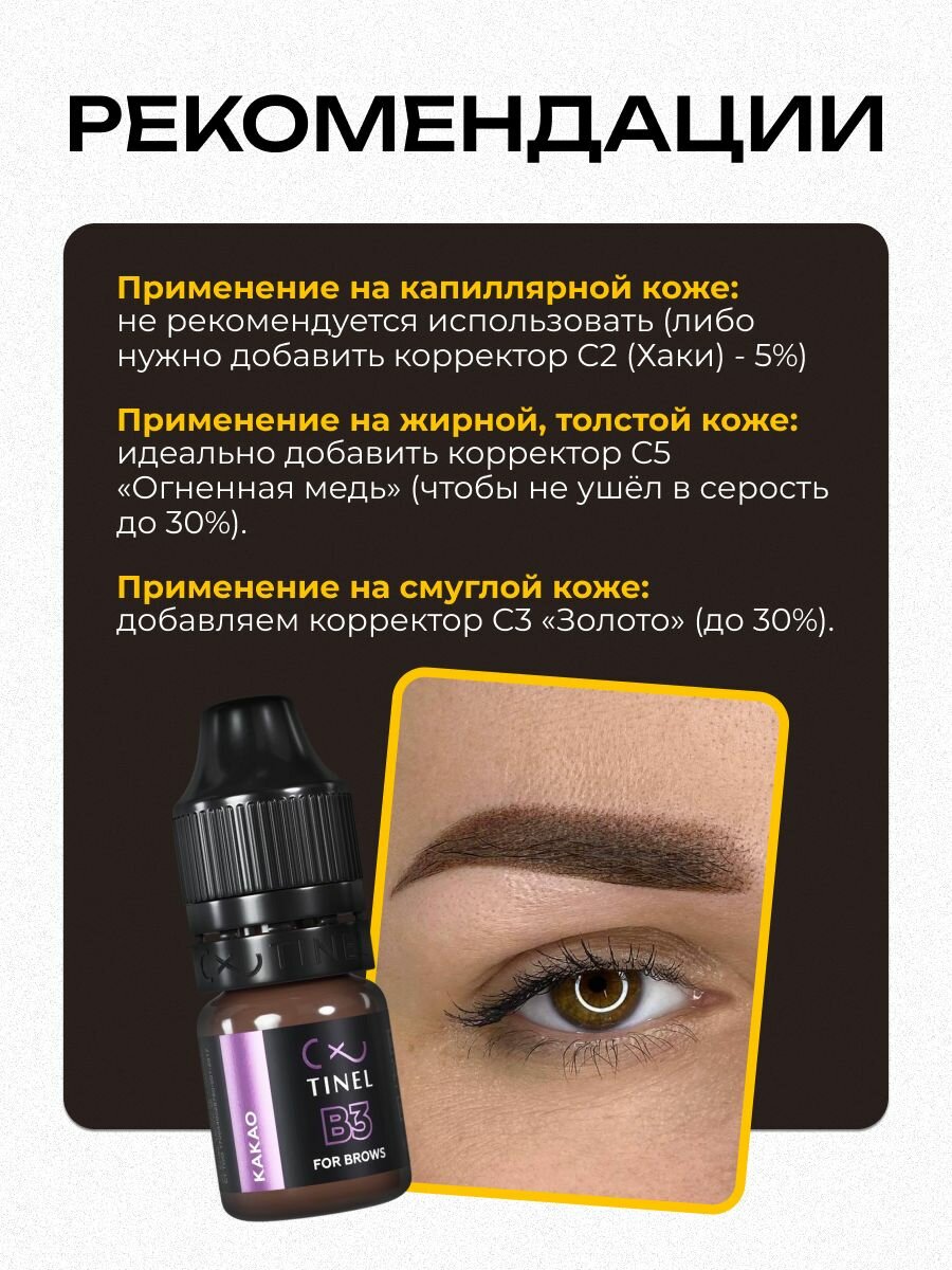 Гибридный состав (неорганика + органика). Подходит для аппаратных техник. Идеально подходит для шатенок, брюнеток. Очень насыщенный темно-коричневый оттенок. Один из самых популярных оттенков Тинель. Идеально подходит для растушёвки шоколадных тонов на веки. Оранжевая основа. Не рекомендуется использовать на капиллярной коже (либо нужно добавить корректор C2 (Хаки) - 5%) . На жирной, толстой коже идеально добавить корректор C5 «Огненная медь» (чтобы не ушёл в серость до 30%). На смуглой коже - добавляем корректор C3 «Золото» (до 30%). За счёт техники нанесения можно сделать как полупрозрачный эффект, так и декоративно-визажный перманент.