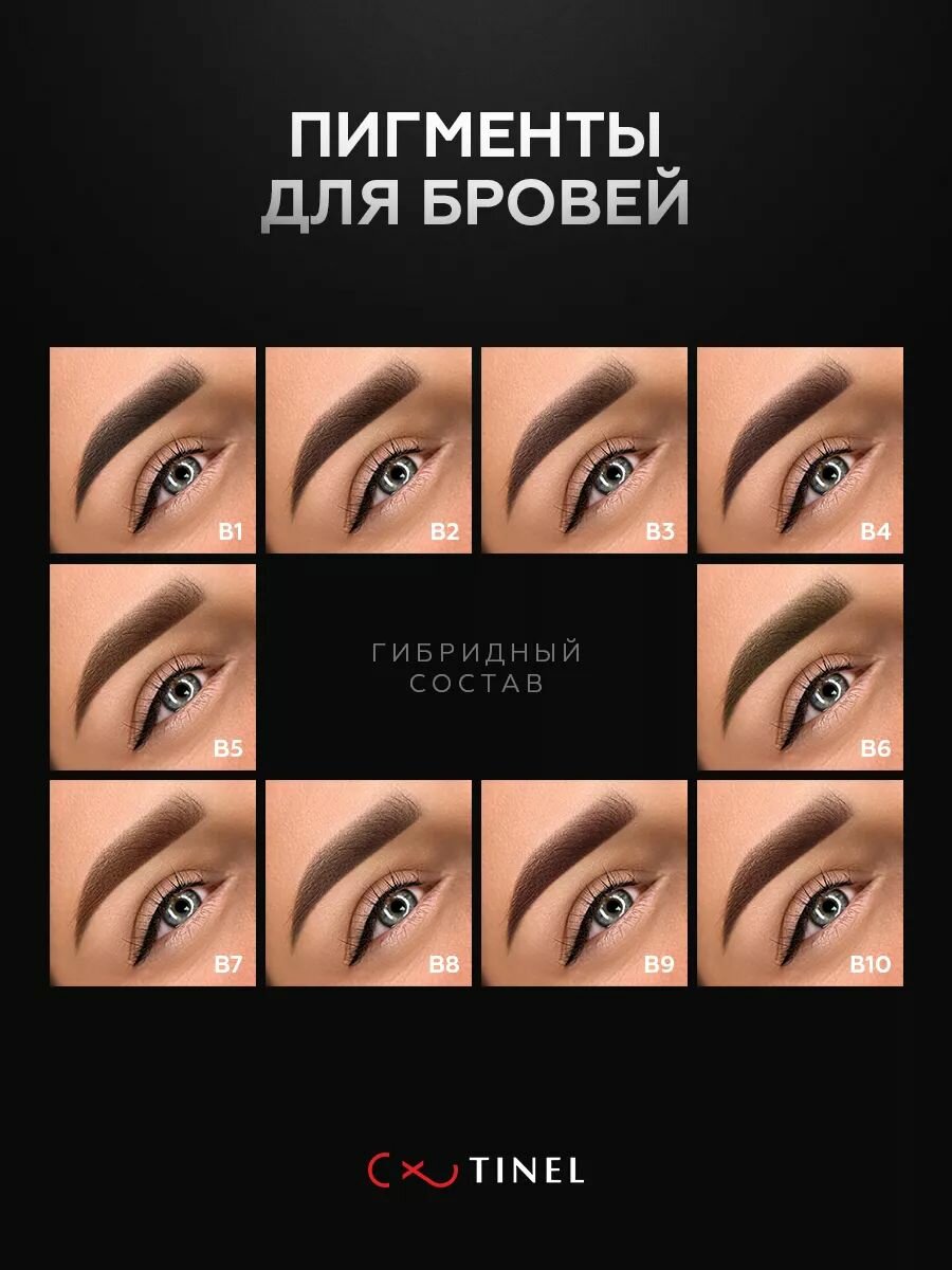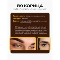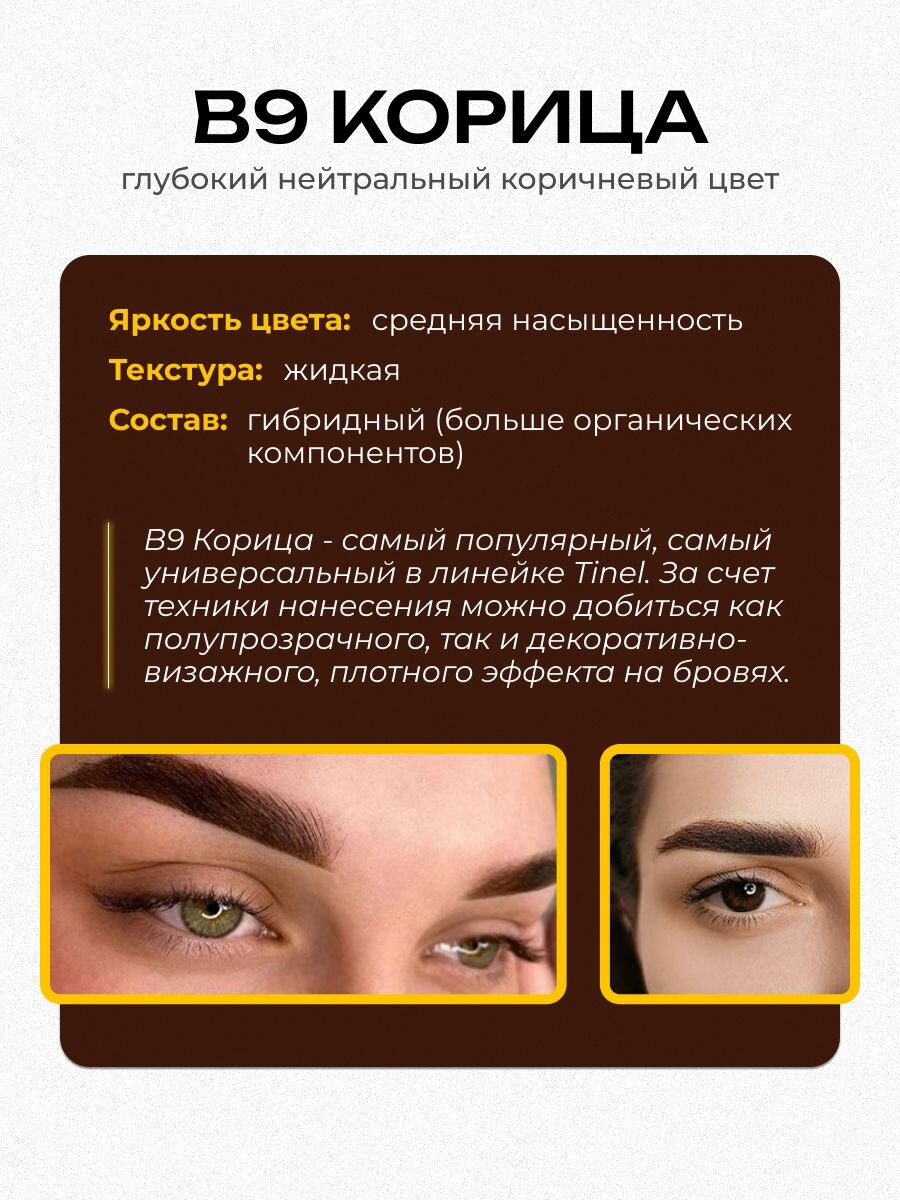 B9 - «Корица» пигмент для перманентного макияжа бровей. Гибридный состав (органика + неорганика). Самый популярный оттенок пигментов Тинель в серии B. Богатый темно-коричневый цвет для бровей. Желтая основа. На смуглой , толстой , жирной коже заживает темно-коричневым, иногда русо-коричневым оттенком. На тонкой, тёплой коже заживает золотисто-коричневым оттенком. За счёт техники нанесения можно сделать как полупрозрачный эффект, так и декоративно-визажный перманент.
