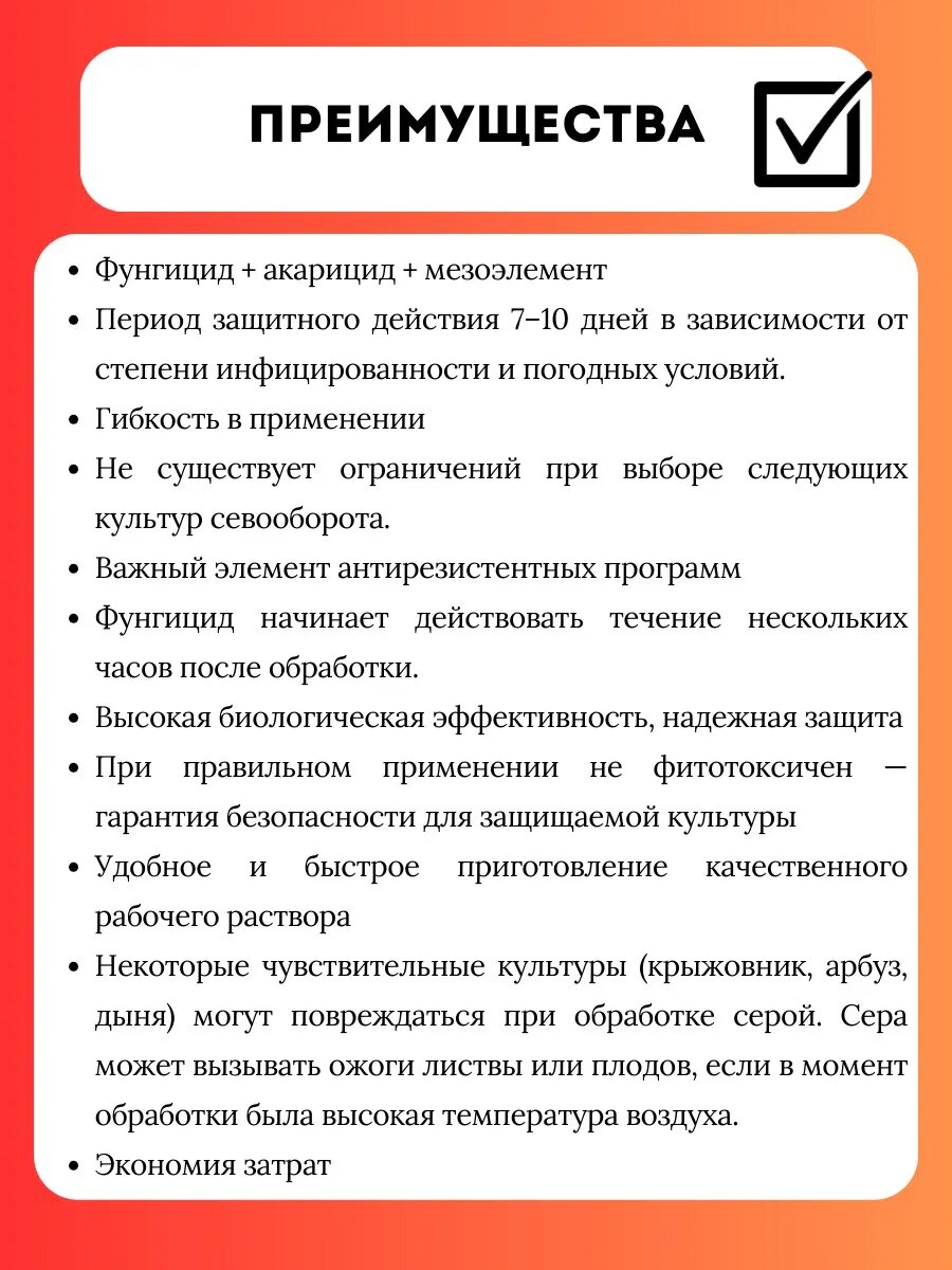 Тиовит Джет-Фунгицид и акарицид для защиты винограда, плодовых и овощных культур от настоящей мучнистой росы. Препарат разрешен к применению на цветочных культурах. Механизм действия: в состав фунгицида Тиовит Джет входит одно действующее веществ: Сера - является акцептором водорода и способствует нарушению нормального течения реакций гидрирования/дегидрирования. Вещество в оболочке или внутри жизнеспособных спор превращается в сероводород, подавляющий ферменты дыхания – полифенолаксидазу и прочие. Процесс образования сероводорода тесно связан и с прорастанием спор и жизнеспособностью гриба. Споры, которые потеряли способность к прорастанию, сероводород из серы образовывать не могут. Поэтому, синтез сероводорода можно рассмотреть как детоксикацию элементарной серы. Сероводород является фунгитоксичным. Элементарная сера связывая металлы, входящие в состав ферментов (цинк, медь, железо, марганец) образует сульфиды. Инактивация сероводородом ферментов и связывание металлов элементарной серой нарушает метаболизм гриба, вызывая его гибель. Преимущества: Фунгицид + акарицид + мезоэлемент Период защитного действия 7–10 дней в зависимости от степени инфицированности и погодных условий. Гибкость в применении Не существует ограничений при выборе следующих культур севооборота. Важный элемент антирезистентных программ Фунгицид начинает действовать в течении нескольких часов после обработки. Высокая биологическая эффективность, надежная защита При правильном применении не фитотоксичен — гарантия безопасности для защищаемой культуры Удобное и быстрое приготовление качественного рабочего раствора Некоторые чувствительные культуры (крыжовник, арбуз, дыня) могут повреждаться при обработке серой. Сера может вызывать ожоги листвы или плодов, если в момент обработки была высокая температура воздуха. Экономия затрат