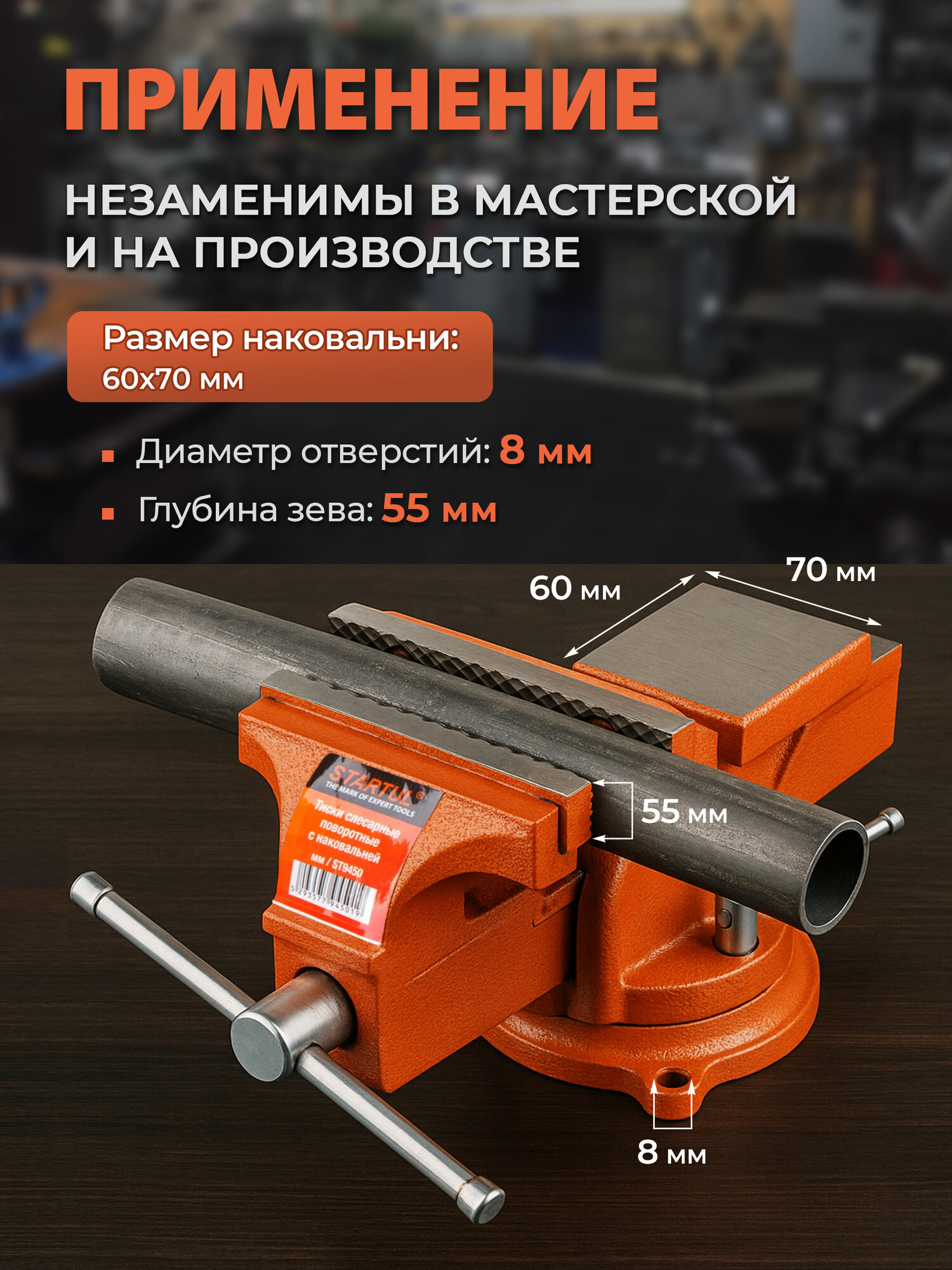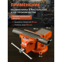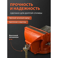 Тиски слесарные 100 мм поворотные STARTUL Master (ST9500-100) представляют собой надежное и функциональное оборудование для ручной и механической обработки деталей. Ширина губок составляет 100 мм, что позволяет зажимать детали с максимальным раскрытием губок до 75 мм. Глубина зева составляет 55 мм, а рифленые губки обеспечивают надежный захват деталей. Винтовой зажим с усилием зажима 1300 Н гарантирует прочное крепление деталей. Корпус тисков изготовлен из чугуна, что обеспечивает их долговечность и устойчивость к механическим воздействиям. Поворотное основание позволяет легко и быстро менять положение тисков и обрабатывать детали под разными углами. Тиски слесарные STARTUL Master оснащены винтовым механизмом позиционирования, что обеспечивает удобство и точность при работе с деталями. Вес тисков составляет всего 5,5 кг, что делает их удобными для транспортировки и хранения. Размер наковальни: 6x7 см. Диаметр отверстий для крепления к столу 8 мм. Слесарные тиски STARTUL Master являются отличным выбором для профессионалов и любителей, которые ценят качество, надежность и функциональность своего рабочего инструмента