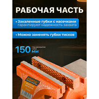 Корпус тисков изготовлен из чугуна, что обеспечивает их долговечность и устойчивость к механическим воздействиям. Поворотное основание позволяет легко и быстро менять положение тисков и обрабатывать детали под разными углами.