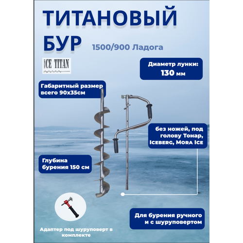 Титановый бур Ладога ICE TITAN 1500/900 D130R-6; Под голову Тонар, Iceberg, Mora Ice; Для бурения ручного и с шуруповертом; Телескопический бур с выдвижной штангой 750мм; Габаритный размер 90х35см; В комплекте с шнеком идет адаптер с ручкой на подшипниках 18мм с крепежом; Вращение: Правое. По часовой стрелке; Диаметр лунки: 130 мм; Толщина льда: 1500 мм; Количество витков спирали: 6 спирали; Шаг спирали: 115 - 120 мм; Ширина спирали: 110 - 112 мм; Ножи: без ножей, под голову Тонар, Iceberg, Mora Ice; Чехол: ткань; Материал: Титан; Вес бура: 2 кг; Вес адаптера: 500 гр; Тип ручки Рапала; Адаптер под шуруповерт в комплекте; ICE TITAN бренд под которым изготавливаются лучшие в Мире титановые ледобуры Ленинградского Северного Завода (ЛСЗ) Титановые ледобуры Ice TITAN не ржавеют и остаются в первоначальном состоянии долгие годы. Ледобуры Ice TITAN изготавливаются в ручную по уникальной технологии, которая недоступна другим компаниям. У нас трудятся лучшие специалисты своего дела