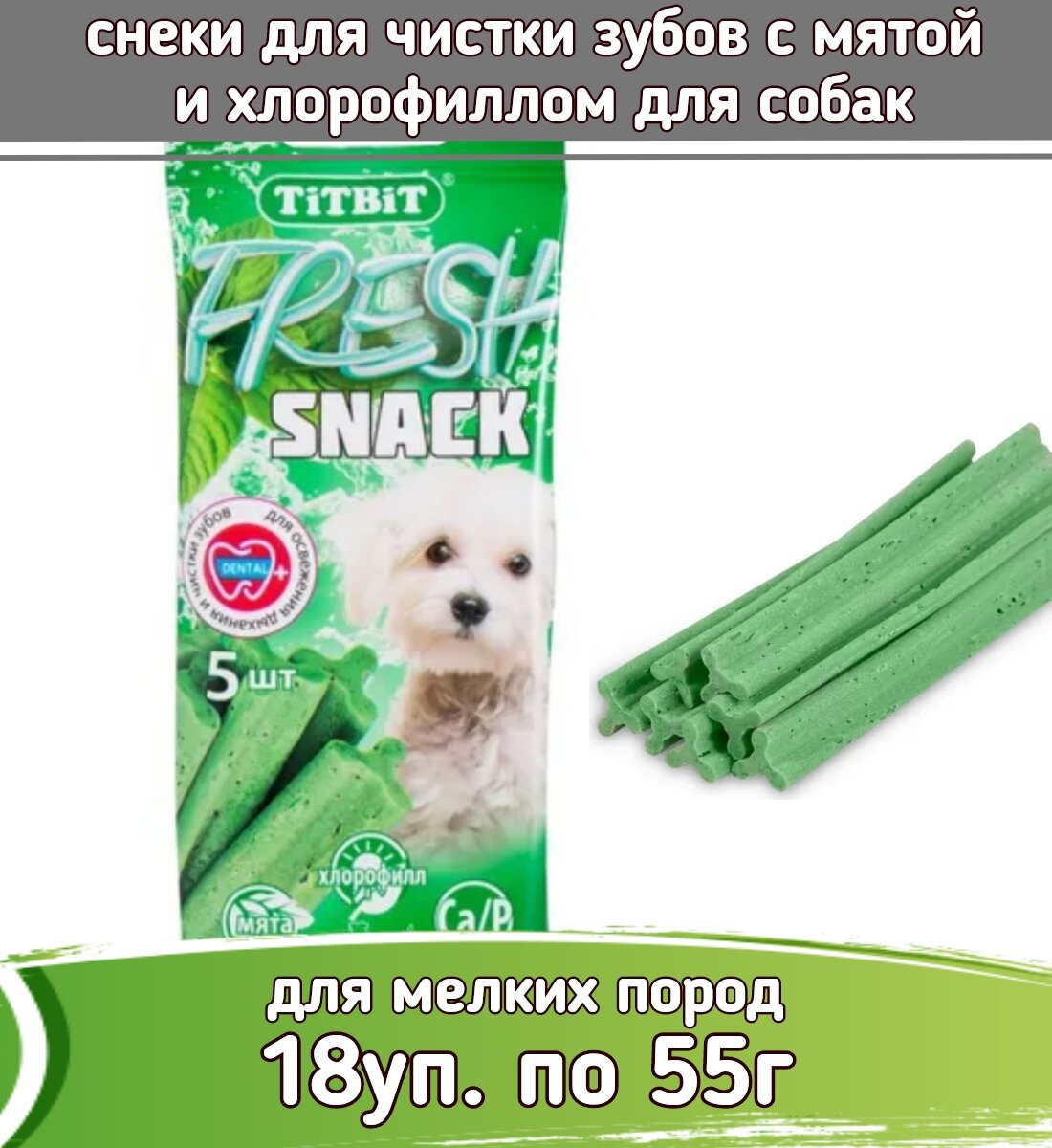 TiTBiT Fresh 18шт х 55г лакомство снеки с мятой и хлорофиллом для собак мелких пород: сравнение цен, характеристики, фото, актуальное наличие и цены.