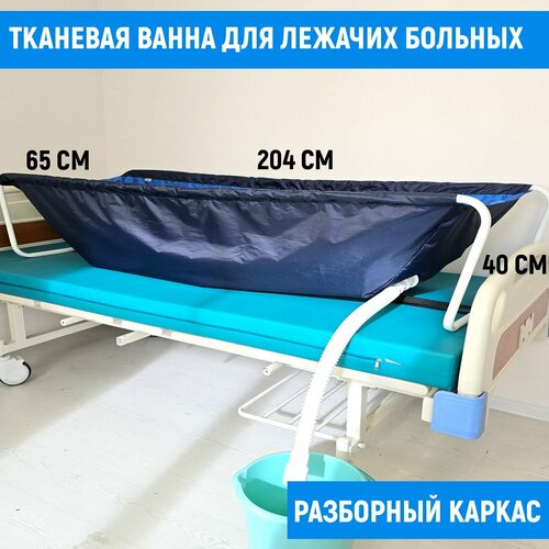 Тканевая часть конструкции крепится к каркасу, формируя ванну для мытья лежачих больных. Важно отметить, что изделие не предназначено для наполнения водой. Для слива в нижней части предусмотрено отверстие, через которое вода должна постоянно сливаться, а закрывать слив можно только на короткое время, например, чтобы заменить наполненную емкость. Простыню-ванну легко использовать для купания лежачих больных и хранить в домашних условиях, а также в лечебных учреждениях.