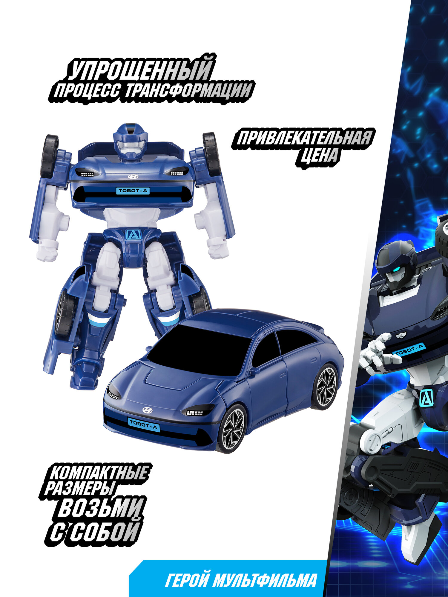 Игрушка-трансформер мини Тобот A создана по мотивам 2-го сезона мультсериала "Тоботы" и представляет собой уменьшенную копию тобота А, который превращается в мини-версию машинки Hyundai Motors IONIQ6. Является 100%-оригинальным лицензионным продуктом. В набор входит игрушка-трансформер, комплект наклеек для машинки и инструкция в картинках. Игрушки по мотивам мульт героев всегда вызывают повышенный спрос у детей, развивая при этом фантазию. Кроме того, робот-трансформер хорошо развивает мелкую моторику рук и пространственное мышление. Отличный подарок по любому поводу. Порадуйте своего ребенка мини Тоботом А или соберите целую коллекцию Тоботов! Весь товар сертифицирован. Внимание! Не предназначено для детей младше 3-х лет!