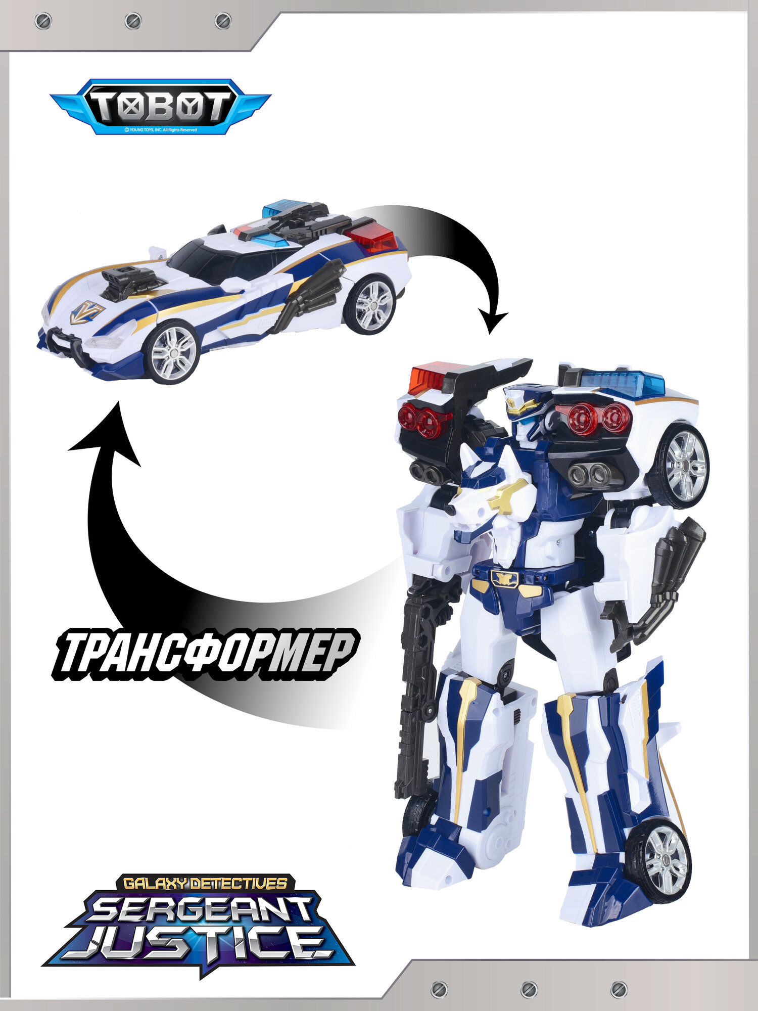 Лицензионная игрушка-трансформер Тобот Сержант Джастис создана по мотивам одноименного персонажа мультсерила "Тоботы Детективы Галактики" (сезон 1). 100% оригинал. Тобот трансформируется в полицейскую машину. В наборе также идет игрушечное оружие. Средняя сложность трансформации. Красочная инструкция в картинках поможет при возникновении трудностей. Игрушки по мотивам мультгероев всегда вызывают повышенный спрос у детей, развивая при этом фантазию. А игрушка-трансформер развивает мелкую моторику рук и, что важно, пространственное мышление. Отличный подарок по любому поводу. Порадуйте своего ребенка Тоботом Сержант Джастис или соберите целую коллекцию Тоботов! Весь товар сертифицирован. Внимание! Не предназначен для детей до 3-х лет!