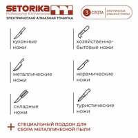 Точилка электрическая для ножей с алмазными абразивными дисками - незаменимый помощник в любом доме. Идеально затачивает все кухонные ножи, хозяйственно-бытовые ножи, складные ножи, туристические ножи. Ножеточка подходит для любых металлических, твердосплавных, керамических ножей и ножей из дамасской стали. Кухонный станок для заточки ножей Сеторика не требует специальных навыков, электроножеточка затачивает оборудование под нужным углом без лишних усилий. Профессионально, быстро, безопасно Чем меньше «шаг» имеет точильный станок при переходе от одного размера зерна к другому, тем качественнее и легче получается заточка режущей кромки ножа. Для идеального результата имеет 3 ступени заточки: 1 слот для грубой заточки (алмазный диск 360 грит) - сформирует режущую кромку и сбалансируйте лезвие 2 слот для тонкой заточки (алмазный диск 600 грит) - заточит лезвие и восстановит v-образную форму 3 слот - финишная заточка и шлифовка (керамический диск 1200 грит) - даст максимальную остроту и идеально гладкую поверхность режущей кромки Если нож нужно слегка подточить, первую стадию заточки можно пропускать. Электроточилка оснащена инновационной технологией пружинных направляющих Spring Guide System - система подпружиненных направляющих, которая обеспечивает точный контроль угла подвода лезвия к алмазным дискам, и как результат, правильная заточка ножей различной толщины. Для сбора металлической пыли в корпусе точилки предусмотрен специальный поддон, который легко вынуть и очистить. Электроточило спрятано в прочный и эргономичный корпус, который обеспечивает удобство и безопасность при заточке ножей. Тихая работа двигателя в сочетании с прорезиненными антивибрационными ножками позволяет наслаждаться процессом и радоваться результату. Работает от сети. Стабильно и надежно, не нужны батарейки и аккумуляторы. Благодаря компактным размерам и современному дизайну разместится на любой кухне и станет ее практичным украшением. Удобная, современная, надежная точилка Сеторика в элегантной коробке будет отличным семейным подарком. Подарок отлично подойдет как мужчине, так и женщине. Полезный подарок на праздник или день рождения маме, папе, жене или мужу. Несомненно такой презент будет приятен бабушке или дедушке. Мы проверяли! С уважением, ваша команда Setorika!