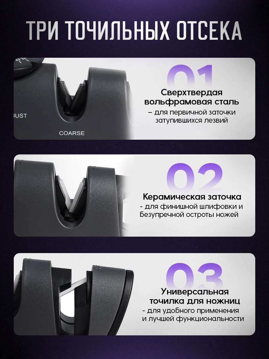 Наша ножеточка с регулируемым углом и камнями из карбид вольфрама и керамического абразива подарит вашим кухонным ножам острую грань, как у шеф-повара! Никаких мучений с точильными алмазными брусками и сложными автоматическими станками! Механическая ножеточилка Risam идеально подходит для полировки, заточки и ухода за керамическими ножами. С ней даже заточка спусков и подводов станет легкой задачей! Профессиональная автоматическая точка острая грань у вас дома!
