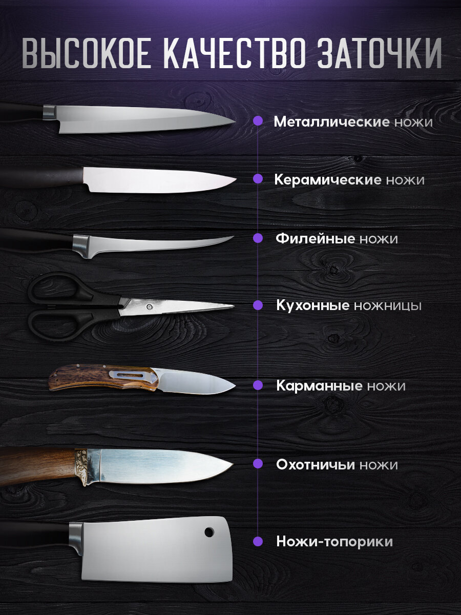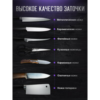 для керамических ножей, для ножниц, для охотничьих ножей, для поварских ножей, для серрейторных лезвий, для складных ножей, для филейных ножей, для хлебных ножей, заточка односторонняя