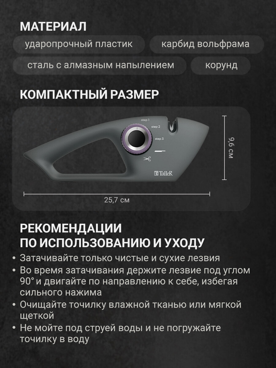 Купить Точилка для ножей и ножниц TalleR TR-62512 Дартфорд, 3-х ступенчатая заточка с доставкой по всей России. Точилка для ножей и ножниц TalleR TR-62512 Дартфорд, 3-х ступенчатая заточка: сравнение цен, характеристики, фото, актуальное наличие и цены.