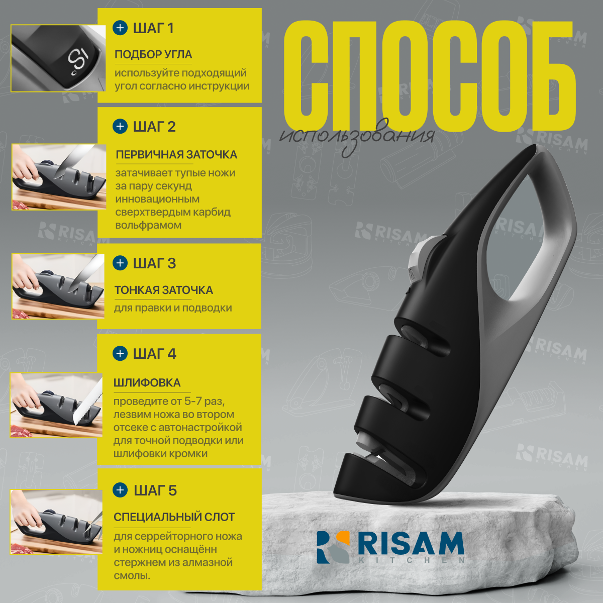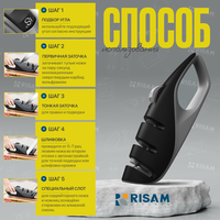 Эта ручная рыбка ножеточка сама подберет угол! Камни из карбид вольфрама, алмазный и керамический абразив заточат кухонные ножи, ножницы и топор до бритвенной остроты! Точильный камень, как на станке, обеспечит острую грань! Подвод, спуски, полировка – проще простого! С Risam даже керамические ножи будут резать идеально! Точило это лучшее приспособление для заточки, точки!