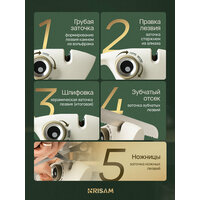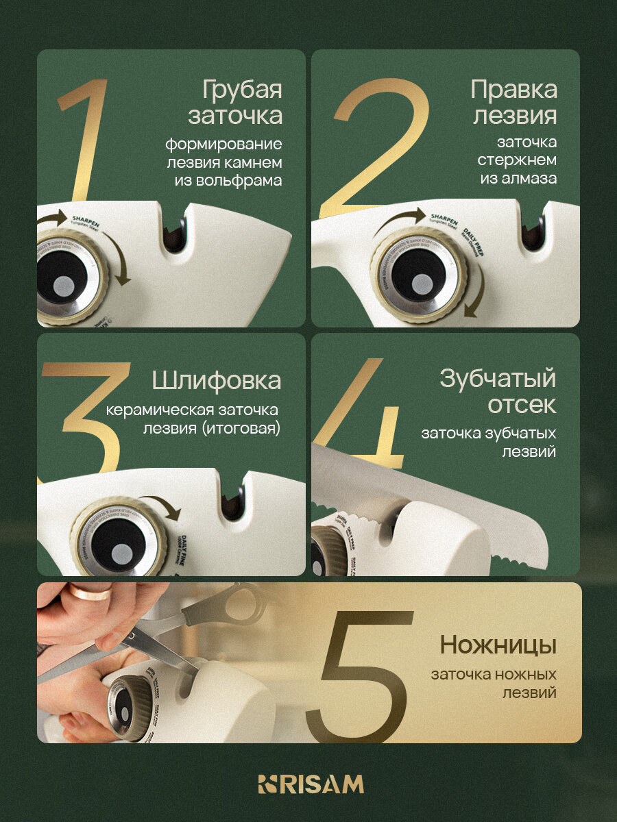 Risam – это автоматическая ножеточка с подбором угла для идеальной заточки кухонных ножей, ножниц и даже… сирейторных ножей! Алмазный точильный камень с регулируемым уголом сделают острой грань любого лезвия! С ней легко делать полировку, точку, спуски и подвод! Проще, чем станок – результат, как у профессионала! Точило это приспособление для точки керамических ножей! Устройство для заточки