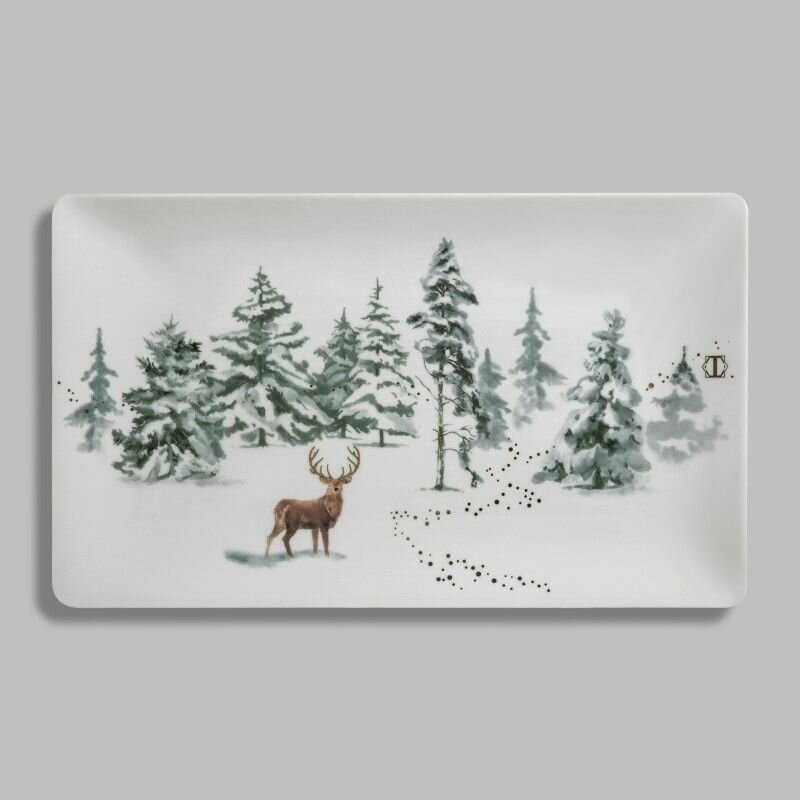 Большое прямоугольное блюдо «Сноуви» изготовлено из высококачественного белоснежного фарфора. Очень прочный, термостойкий фарфор удобен в применении, при его создании использовалось экологически чистое сырье, что важно для посуды и столовых аксессуаров. Он практически не меняется спустя долгое время, не тускнеет, сохраняет свою белизну и блеск. Блюдо оформлено зимним пейзажем: это снежный лес и олень с ветвистыми дорогами, бредущий по снегу. Рисунок выполнен в акварельной технике. Деликатная акварельная размытость красок прекрасно подходит для зимнего заснеженного образа. Изюминка «Сноуви» – элегантное декорирование золотом 24 карата. Блюдо подойдет для фруктов, сладостей или закусок на новогоднем столе. Его можно также дополнить другой посудой и аксессуарами из коллекции «Сноуви».