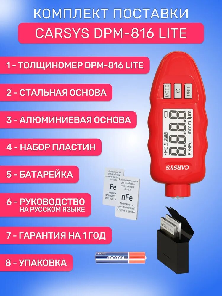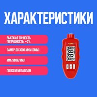 Прибор предназначен для измерения толщины лакокрасочных покрытий (краска, пластик, грунтовка, шпаклевка, и др.) до 3000мкм по чёрным, цветным и оцинкованным металлам с погрешностью ± 3% + 1 мкм. В отличии от менее качественных производителей, у карсис нет функции подгона показаний. (каждое новое измерение отображается на дисплее, а не показывает вам одну и ту же цифру, если показания близки к предыдущему измерению с целью казаться точнее).
