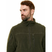 Полочки толстовки украшены отрезными бочками с карманами на молнии в швах. На левой полочке расположен верхний прорезной карман на молнии, что обеспечивает дополнительное удобство в использовании.