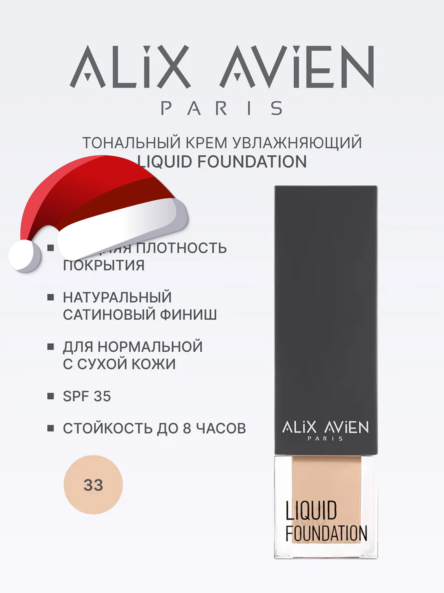 | Способ применения | Встряхнуть перед использованием: нанести достаточное количество на лицо, начиная от центра, равномерно растушевывая к периферии лица. Рекомендуется использовать кисть для тональной основы Alix Avien Foundation Brush или спонж для макияжа. |