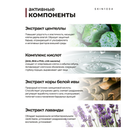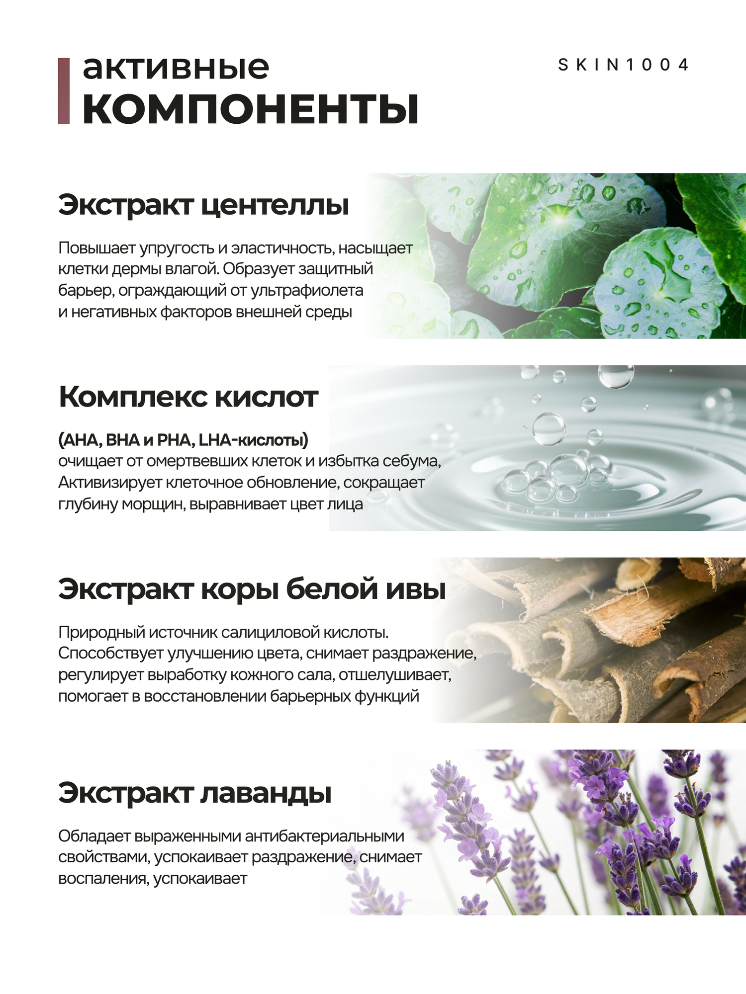 | Активный ингредиент | AHA-кислоты, D-пантенол, PHA-кислоты, ВНА-кислоты, аденозин, азелаиновая кислота, азиатиковая кислота, аллантоин, аминокислоты, антиоксиданты, аргинин, бета-глюкан, бетаин, бисаболол, бифидобактерии, витамин A (ретинол), витамин B3 (ниацинамид), витамин C (аскорбиновая кислота), витамин E, витамины, витамины группы B, галактомисис, гиалуроновая кислота, гликолевая кислота, глицерин, глюконолактон, камфора, керамиды, коллаген, коэнзим Q10, коэнзимы, лактобактерии, лецитин, лимонная кислота, липиды, мадекассосид, минералы, морская соль, мочевина, пантенол (провитамин B5), пептиды, пребиотики, пробиотики, розовая вода, салициловая кислота, сквалан, сок алоэ, спирт, транексамовая кислота, фруктовые кислоты, центелла азиатская, церамиды, экстракт ромашки, энзимы |