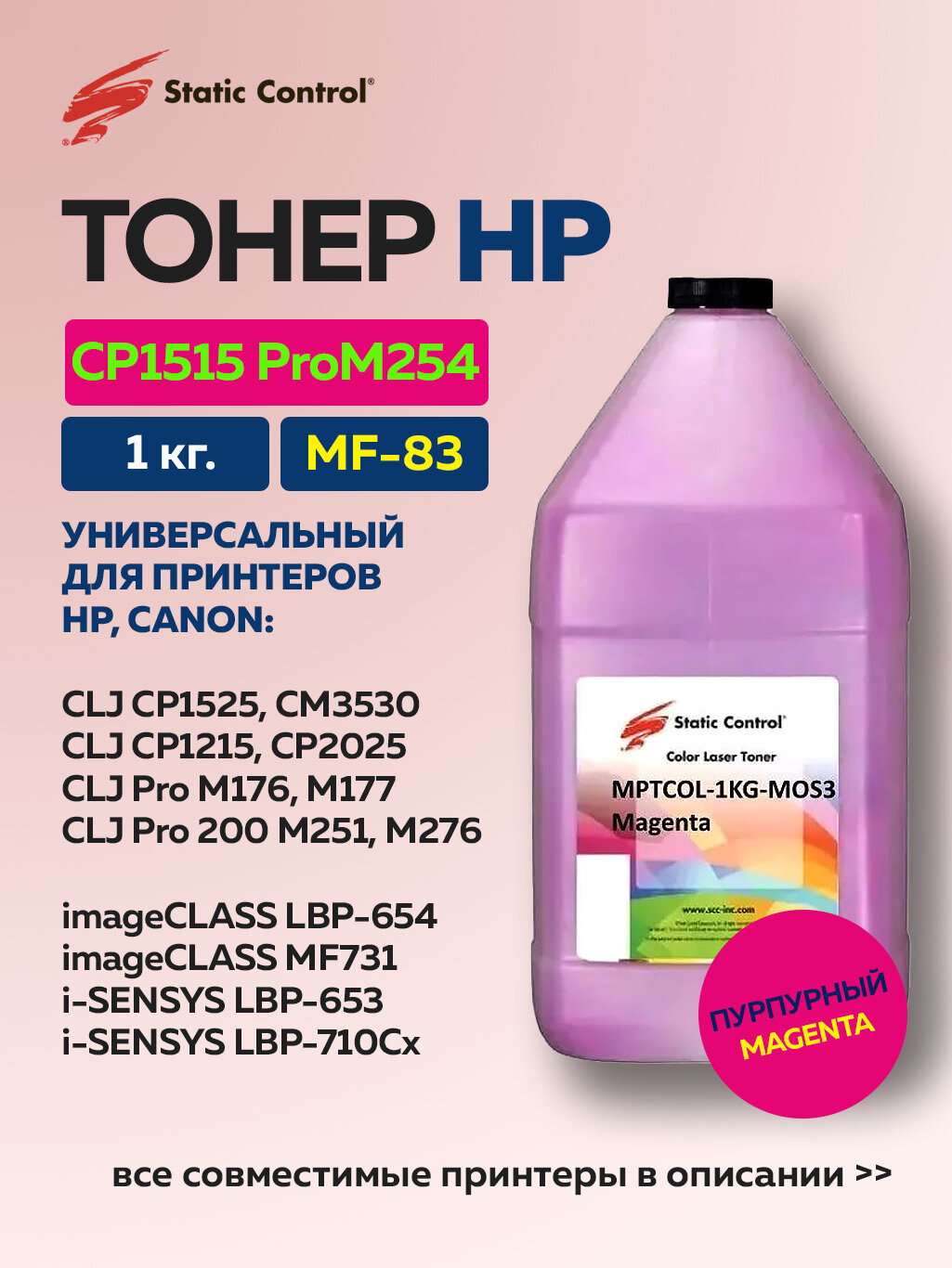 Тонер Static Control MPTCOL для HP CLJ CP1515/Pro M254/Pro M454/Canon MF-83, пурпурный, 1 кг: сравнение цен, характеристики, фото, актуальное наличие и цены.