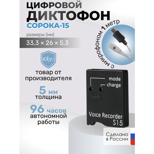 Диктофон "Сорока-15" - это высококачественный цифровой диктофон, который обеспечивает продолжительную работу до 96 часов. Он оснащен функцией активизации по голосу, что позволяет начать запись при обнаружении звука.