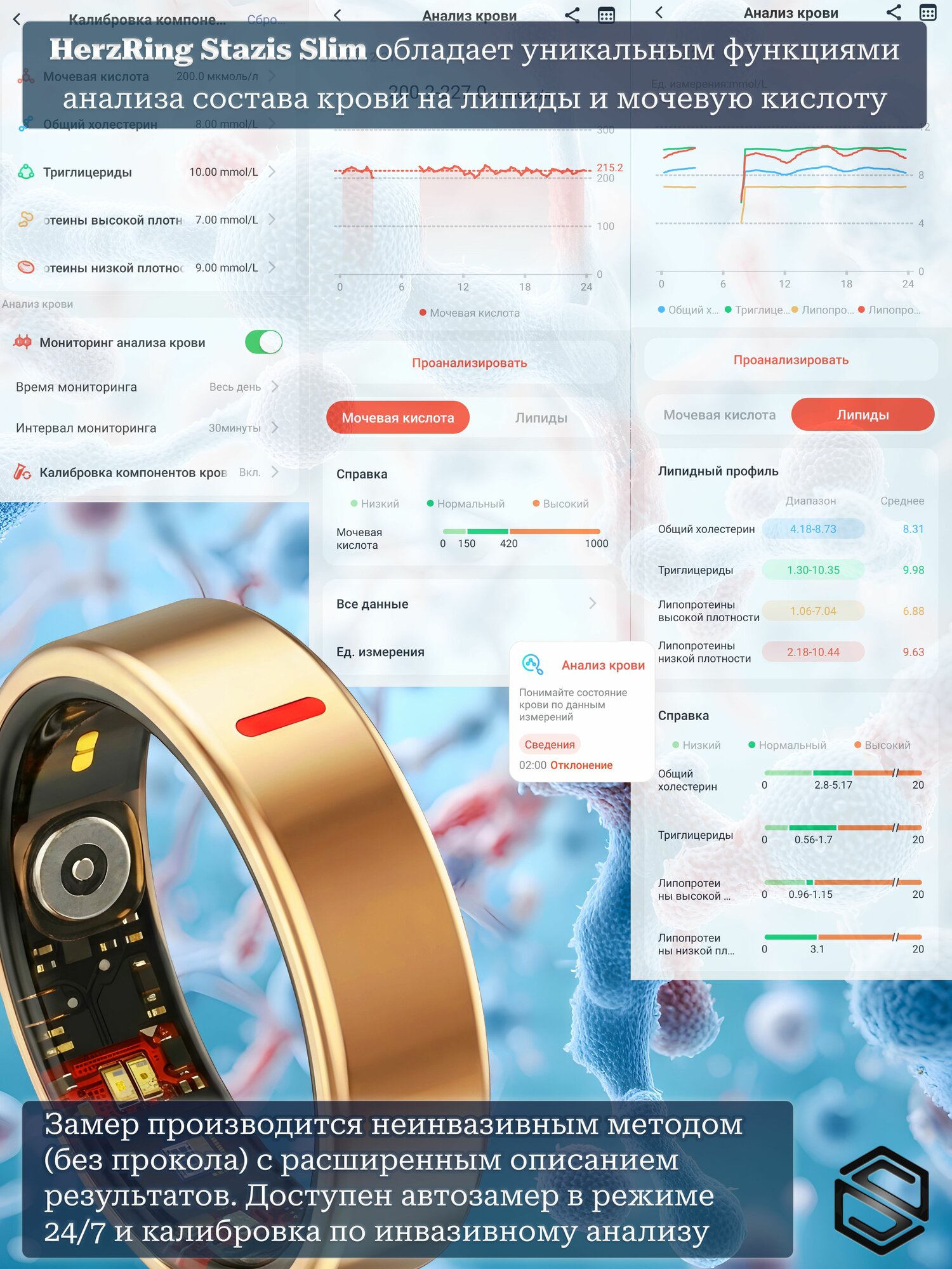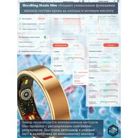 HerzRing Stazis Slim: Лаборатория здоровья на вашем пальце Умное кольцо нового поколения, сочетающее медицинскую точность с элегантным дизайном. Stazis Slim — это ваш персональный цифровой ассистент для круглосуточного мониторинга организма неинвазивным методом. Ключевые клинические метрики: Анализ крови: Мочевая кислота, холестерин (общий, триглицериды, липопротеиновый индекс и плотность). Индивидуальная калибровка под вашу базу. Кровяное давление: Измерение САД и ДАД (мм рт. ст.) с оценкой. Глюкоза: Замер уровня сахара (mmol/L). Точная калибровка по 6 точкам (до и после каждого приема пищи). Кислород в крови (SpO2): Измерение сатурации. Показатели резервов организма: ВСР (HRV): Оценка "жизненных сил" и вариабельности сердечного ритма. Режим "Диаграмма Лоренца" для углубленного анализа регуляции сердца. Стресс: Оценка по шкале 0-100 с разделением на 4 диапазона. Сон: Детальный анализ фаз (глубокий, REM, легкий) и качества. Отслеживание женского цикла. Фитнес-компаньон: Огромное количество спортивных режимов (бег, велоспорт, плавание, йога и др.). Отслеживание пульса, калорий, дистанции. Гибкие интервалы автозамера для любой метрики (от 30 до 180 мин). Экосистема и автономность: Обмен данными о здоровье с близкими. Синхронизация с Apple Health и Google Fit. Поиск устройства, дистанционный спуск затвора камеры. Комплект: легкое (≈3 г) и тонкое (7 мм) кольцо из гипоаллергенной стали и смолы, док-станция с функцией павербанка. Заряда хватает на 4-5 дней. HerzRing Stazis Slim — это осознанное управление здоровьем в формате изящного аксессуара. * Умное кольцо НЕ медицинский прибор, показания носят только справочный характер и не предназначеный для каких либо решений по здоровью, при подозрениях обязательно обратитесь к врачу!