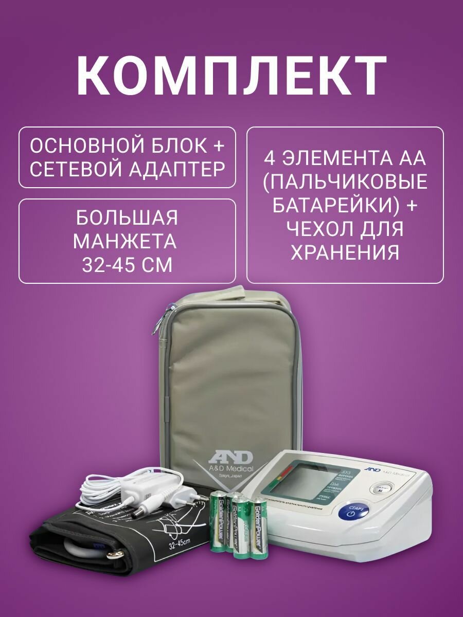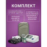 Основной блок в корпусе AND UA-777, Большая манжета AND Cufbox-LA для обхвата плеча 32 - 45 см., Трубка соединительная, Футляр для хранения прибора, Руководство по эксплуатации (на русском языке), Комплект элементов питания тип AA - 4 шт., Сетевой адаптер AND TB-233C, Гарантийная карта
