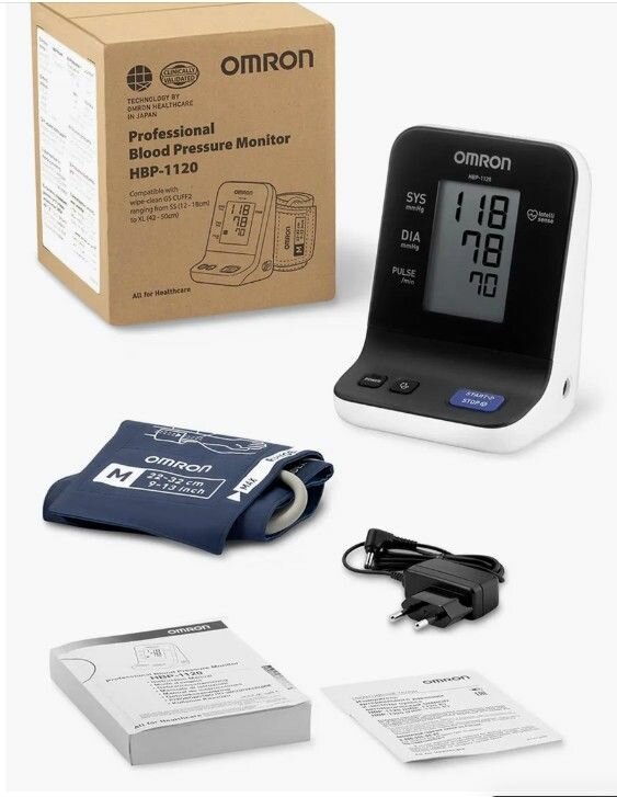 Электронный блок тонометра Omron HBP-1120 Средняя компрессионная манжета Omron (22 - 32 см.) Руководство по эксплуатации Адаптер переменного тока Omron HHP-CM01 Гарантийный талон