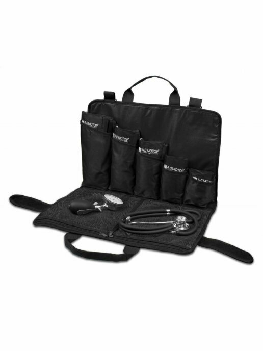 Тонометр отличается расширенной комплектацией, в которую включены дополнительные манжеты и профессиональный стетофонендоскоп. Удобная тканевая сумка с застёжкой и ручками позволяет носить прибор с собой. Описание вложений: специально сконструированная сумка с набором из 5 нейлоновых манжет: увеличенная (25-42 см), -стандарт (24-36 см), -подростковая (20-28 см), детская (14-21 см), -новорожденная (9-15 см); Манометр из металлизированного пластика 65 мм, совмещенный с нагнетателем (тип палм); Стетофонендоскоп с односторонней фонендоскопической головкой для аскультации тонов Короткова у взрослых; Стетофонендоскоп Раппопорта для аскультации сердца, сосудов, легких и тонов Короткова у взрослых и детей.
