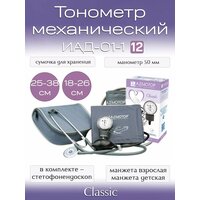 Тонометр механический ИАД-01-1 (серии CLASSIC) комплектация 1 или измеритель артериального давления - прибор предназначенный для измерения систолического (верхнего) и диастолического (нижнего) артериального давления косвенным методом Короткова в медицинских учреждениях и в домашних условиях. В состав тонометра ИАД-01-1 (комплектация 1) для измерения давления входит:- Металлический манометр 50 мм - диапазон измерений от 20 до 300 мм рт. ст;- Стандартная нейлоновая манжета (25-38 см.) с металлической скобой и петлей;- Бесшовная цельнолитая 2-х трубочная пневмокамера из натурального латекса;- Металлический односторонний стетоскоп (стетофонендоскоп);- Нагнетатель (груша) из натурального латекса с металлическим игольчатым регулятором сброса давления (боковой винт);- Сумка для хранения и транспортировки (футляр из нейлона);- Коробка из микрогофрокартона;- Паспорт завода изготовителя с поверкой и гарантией на 12 месяцев с даты продажи.