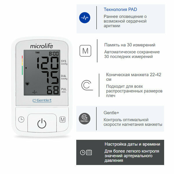| Особенности | измерение пульса, безболезненная манжета, управление одной кнопкой, фиксация даты и времени, шкала ВОЗ |