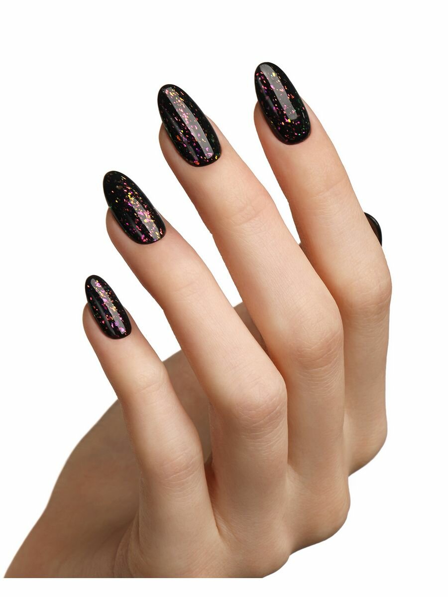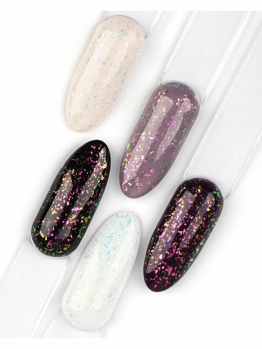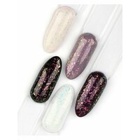 Глянцевое финишное покрытие с мелкими хлопьями цветной потали. В зависимости от цвета подложки, поталь переливается разными градиентами, становится ярче или светлее, придавая маникюру, то легкий игривый эффект, то создавая дерзкий вечерний дизайн маникюра. Не имеет липкого слоя.
