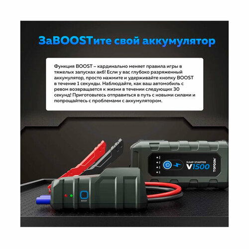 Topdon V1500 - это портативное пусковое устройство, предназначенное для запуска 12В свинцово-кислотных аккумуляторов типов Wet, Gel, MF, Cal, EFB, AGM, VRLA. Оно обеспечивает пусковой ток до 1500 ампер для запуска транспортных средств, таких как автомобили, лодки, мотоциклы, квадроциклы, газонокосилки, тракторы, грузовики и т. д. с 12-вольтовым питанием. Это пусковое устройство предназначено для запуска бензиновых двигателей объемом до 6,5 литров и дизельных двигателей объемом до 4 литров. Оно также имеет возможность запуска устройства до 25 раз на одном заряде и функцию BOOST, позволяющую запускать глубоко разряженные аккумуляторы.