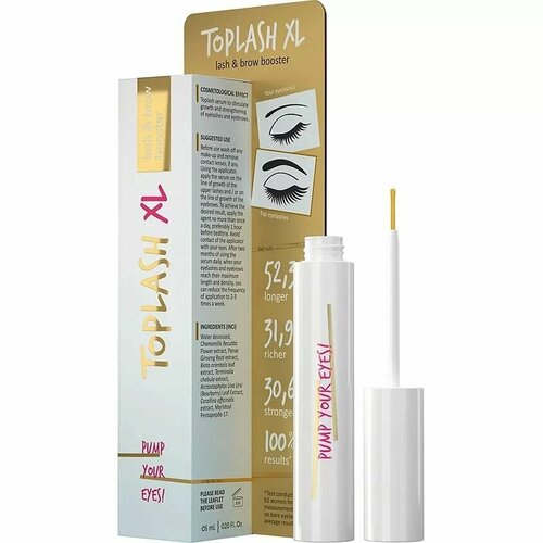 Toplash XL Lash and Brow – инновационная сыворотка для роста ресниц и бровей теперь в новом, экономичном флаконе. Формула учитывает особенности регенеративных процессов, обеспечивая активный быстрый рост волосков, повышенный объем, густоту, надежную защиту от внешнего воздействия. 98% покупателей отметили эффективность сыворотки через 21 день и достижение максимального результата через 8 недель использования . При ежедневном нанесении средство увеличивает длину ресниц на 52,3%, объем - на 31,9%, а также делает укрепляет их на 30,6%, препятствуя раннему выпадению. Сыворотка эффективно и быстро воздействует на структуру волосков, ухаживает за ними, наполняет силой, эффектно преображает внешний вид. Сыворотка также помогает восстановить брови и ресницы, пострадавшие от длительного наращивания, вредных бьюти-процедур, некачественной декоративной косметики, трихологических заболеваний.