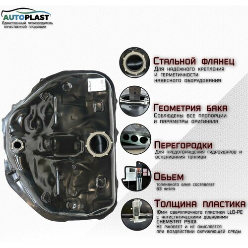 Запатентованная технология производства пластикового топливного бака с металлическим фланцем, гидроударной перегородкой, уловитель минимального уровня топлива.