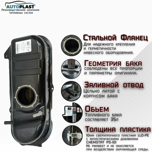 Запатентованная технология производства пластикового топливного бака с металлическим фланцем, гидроударной перегородкой, уловитель минимального уровня топлива.