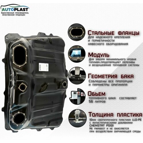 Запатентованная технология производства пластикового топливного бака с металлическим фланцем, гидроударной перегородкой, уловитель минимального уровня топлива.