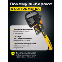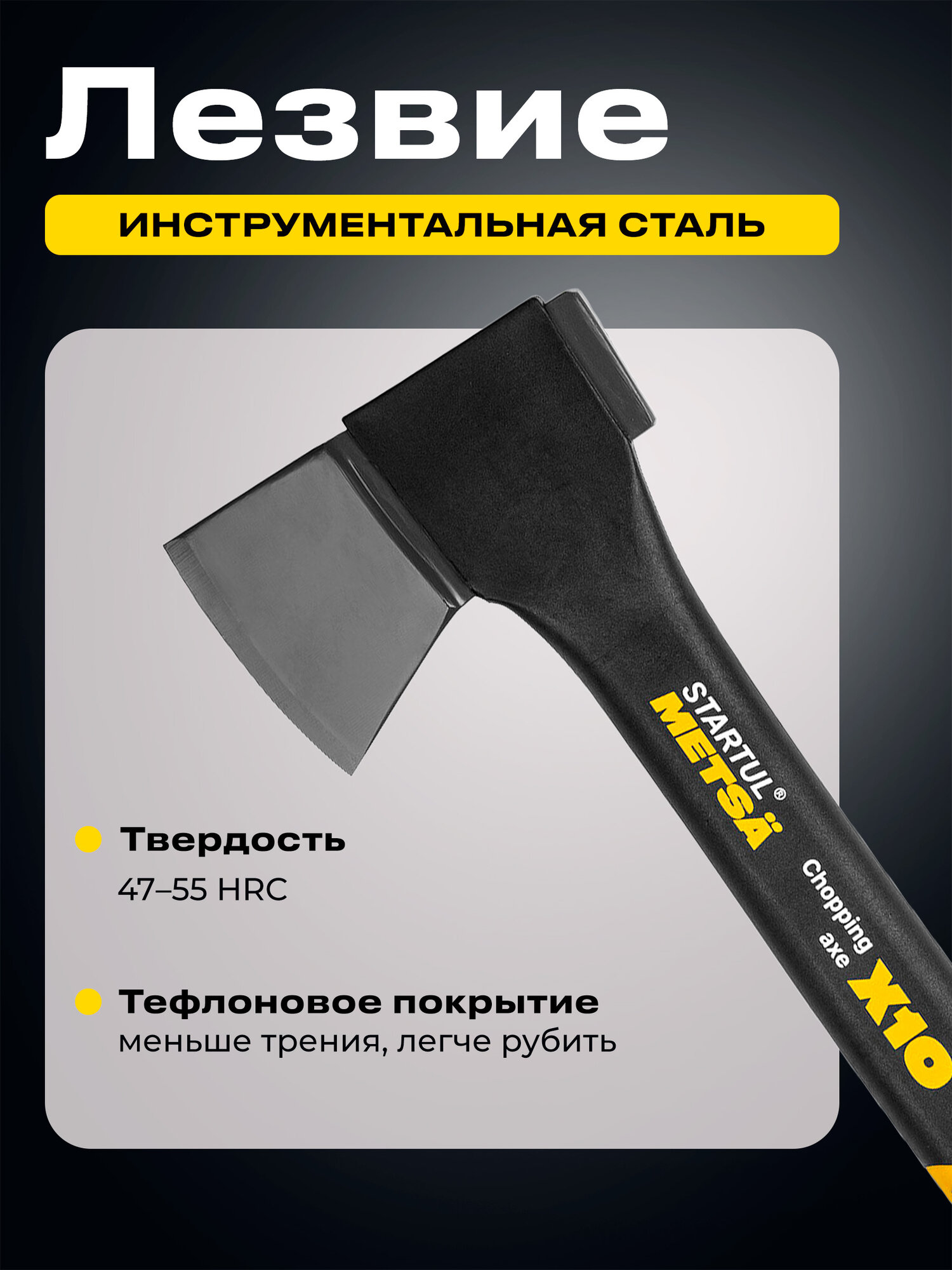 Топор для дров STARTUL METSA (ST2030-10) с фиберглассовой рукояткой -это надежный инструмент предназначен для для выполнения плотницких работ любого типа, для рубки и тесания древесины разнообразных пород. Садовый режущий инструмент с ярким, привлекательным дизайном, сочетает в себе прочность и функциональность, что делает его идеальным выбором для задач по обработке дерева. Колун имеет лезвие высотой 8,8 см из качественной кованой инструментальной стали с тефлоновым покрытием, что обеспечивает надежность и устойчивость к механическим нагрузкам. Идеально подходит для тесания и рубки, делая инструмент универсальным для вашей деятельности. Твердость рабочей кромки, составляющей 47-55 HRC, поддерживает остроту лезвия на длительное время, позволяя с легкостью проникать в древесину и выполнять работу с минимальными усилиями, например колка дров, плотницкие работы и тесания древесины различных пород, а также выборка пазов нужного размера. Рукоятка инструмента из фибергласса очень прочная, но легкая ее длина 450 мм, имеется отверстие для удобного хранения и переноски в подвешенном виде, в качестве защитного чехла для лезвия, можно использовать пластиковый чехол с защелкой, в котором поставляется топорик. Покрытие из термопластичной резины мягкое наощупь, препятствует выскальзыванию топора, удобно лежит в руке, что важно для продолжительного использования инструмента. Используется в походе, на садовом участке, для сада и дачи. Вес инструмента 950 гр, вес полотна 650 гр поставляется. Топоры Стартул подходят для отдыха на природе, прекрасно дополнят любой набор туриста и туристические аксессуары. Многофункциональный плотницкий топор - отличный подарок мужчине, парню, другу, любимому, мужу, отцу, деду. Инструмент подойдет если Вы искали: большой тапор для кемпинга походный топор с собой в поход для охоты. Подходит охотнику, рыбаку, туристу, пожарному, любителям пикника, кемпинга, туризма, похода и шашлыков. Высококачественный топор-колун будет желанным подарком для мужчины на 23 февраля, день рождения, новоселье и без повода. Бюджетный подарок рыбаку, автомобилисту, военному, полицейскому топор для охоты, сада, огорода, дачи, гаража, туризма для похода и рыбалки.