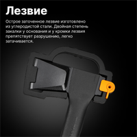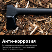 Антифрикционное покрытие топора обеспечивает плавное и легкое движение инструмента, а отшлифованное лезвие с двойной степенью закалки гарантирует высокую прочность и долговечность.