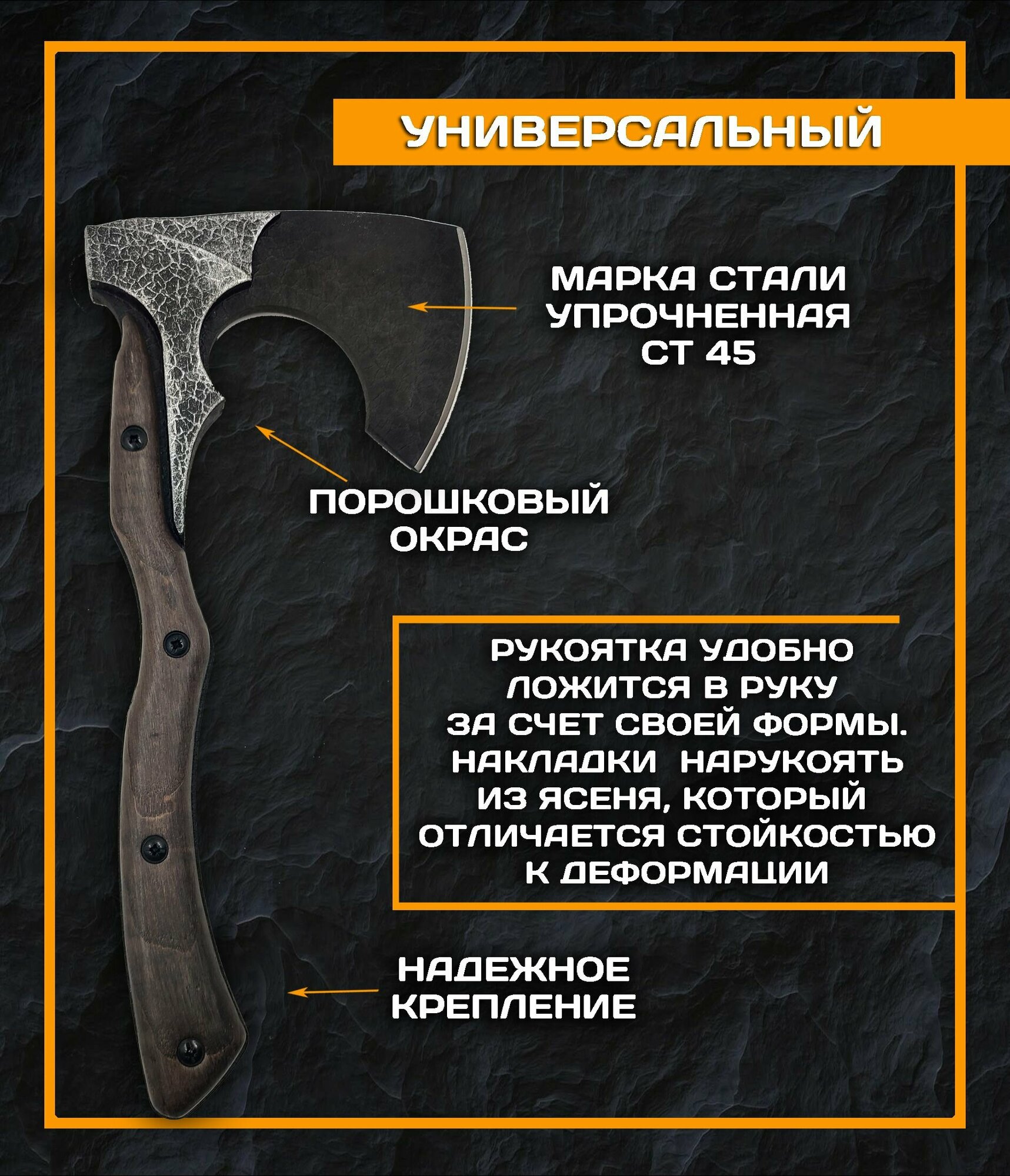 Cталь марки СТ45, рукоять дерево ясень, чехол изготовлен из Натуральной кожи. Общ. длина топора 37 см, длина рукояти 21 см, длина клинка 15 см, ширина клинка 17 см, толщина обуха 5мм.