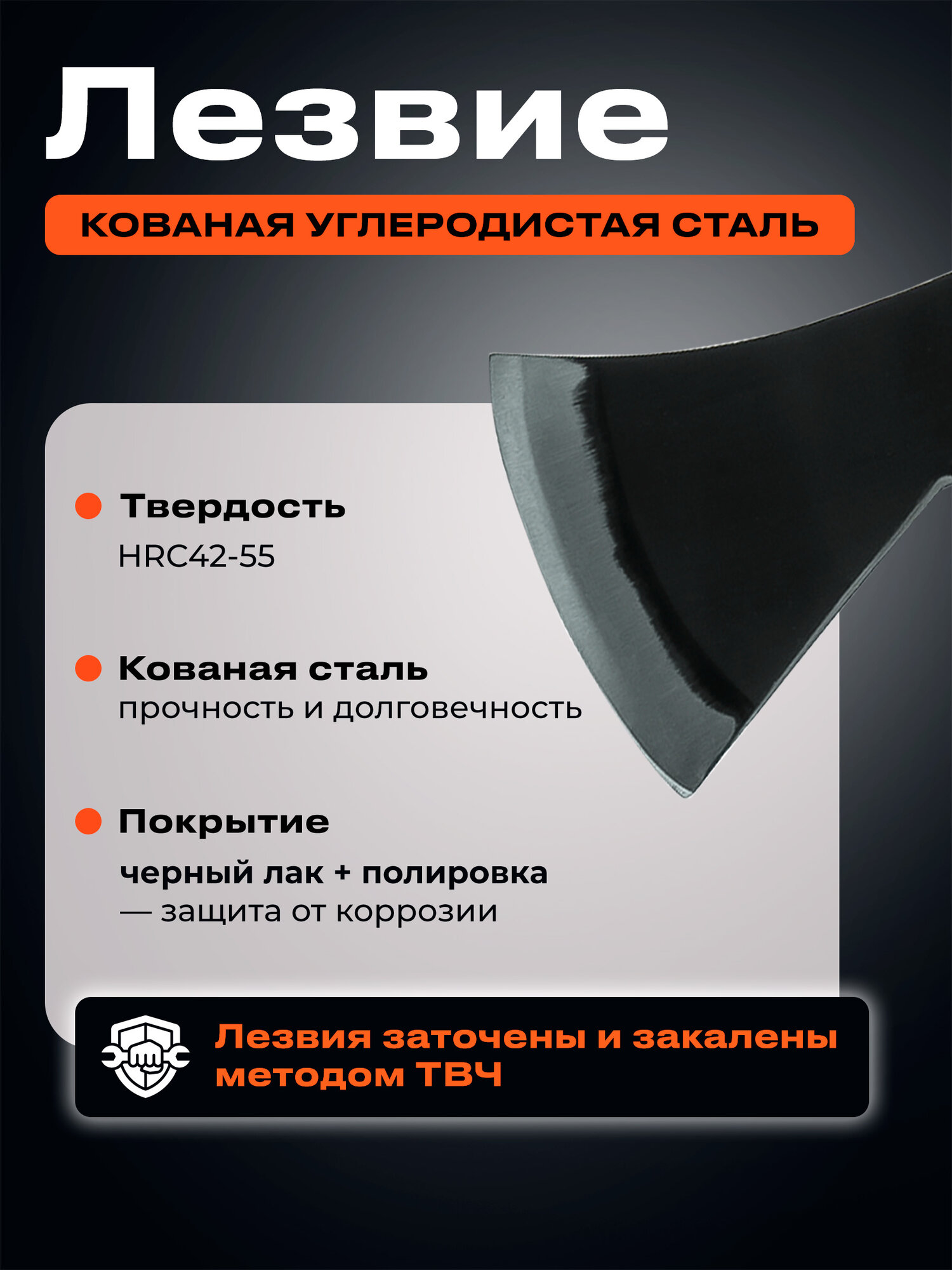 Топор STARTUL PROFI – надежный инструмент для профессионального использования. Основные характеристики: • Вес: 1,25 кг – оптимален для точных и мощных рубящих ударов. • Материал полотна: кованая углеродистая сталь HRC 42-55 с закалкой ТВЧ (высокая прочность и износостойкость). • Покрытие полотна: полировка + черный лак (антикоррозийная защита). • Рукоятка: o Фибергласс (60%) – гасит вибрации, устойчив к ударам и агрессивным средам. o Антискользящее покрытие TPR – обеспечивает надежный хват даже в сырую погоду. o Расширенный край – предотвращает выскальзывание из рук. • Геометрия: o Общая длина: 70 см o Ширина лезвия: 1,5 см o Высота лезвия: 12,3 см ✅ Преимущества: ✔ Острая и прочная заточка – лезвие долго сохраняет режущие свойства. ✔ Безопасность – эргономичная рукоятка с защитой от выскальзывания. ✔ Комфорт – фибергласс снижает ударную нагрузку на руки. ✔ Долговечность – устойчивость к коррозии и механическим повреждениям. Назначение: • Рубка древесины, колка дров. • Плотницкие и столярные работы. • Походное использование, строительство. Идеальный выбор для лесорубов, плотников и туристов, которым нужен удобный, прочный и безопасный топор!
