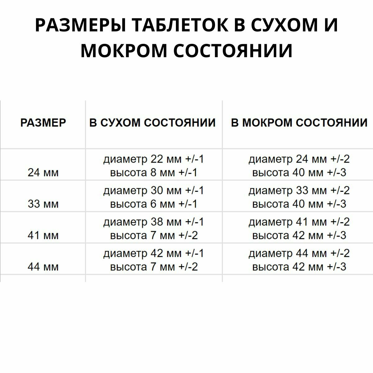 Диаметр таблетки в готовом, намоченном состоянии – 44 мм.