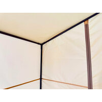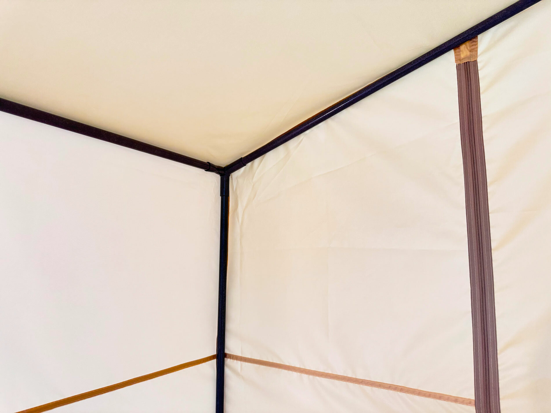 Тент палатки пошит из синтетической ткани oxford 300D PU 2000 устойчивой к воздействию солнечных лучей, плотностью не менее 140 гр. м. кв, водостойкостью не менее 2000 мм водяного столба, температурный режим эксплуатации ткани от -50 до +70°С. Тент сшит прочными армированными нитями 70ЛЛ. На задней части тента имеется вход на 2 молниях. Крепление тента к каркасу осуществляется с помощью завязок. При пошиве тента, для соединения деталей, применяется шов в замок.