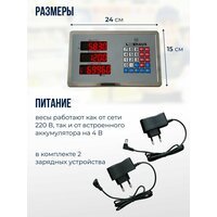 Беспроводные электронные счетные весы серии 300 – новейшая разработка платформенных весов, в которых сигнал датчика соединен с рабочей панелью через беспроводную передачу данных (Bluetooth). Таким образом панель и платформа датчика не соединены кабелем, что позволяет свободно комплектовать и размещать панель. Это существенно повышает свободу и удобство пользования весов и не влияет на точность и скорость реагирования Электронные счетные весы предназначены для измерения массы различных грузов при торговых, учетных и технологических операциях, фасовки и расчета стоимости товара на предприятиях торговли и общественного питания, в различных отраслях народного хозяйства. Автономное питание позволяет этим торговым весам с успехом применяться на рынках, в уличной торговле, в небольших магазинах. Весы обладают высокоточной взвешивающей функцией и оснащены прецизионным датчиком. Память товаров свободна запомнить 7 цен и суммировать стоимость покупки до 99 товаров. Большое число вводимых с клавиатуры настроек позволяет сконфигурировать весы под требования конкретного клиента (округление цены, работа с тарой, и т. д.) Весы бытовые товарные электронные Размер площадки 42х52см Бюджетные товарные весы с торговыми функциями. Индикатор из нержавеющей стали. Предназначены для взвешивания, фасовки и определения стоимости товаров в бытовых условиях, на предприятиях торговли, на складах и производствах. (Весы не требуют поверки). Яркий LCD-дисплей с зеленой подсветкой (цена, масса, стоимость) Вычитание массы тары Переменное и постоянное электропитание Встроенный АКБ Индикатор низкого заряда батареи и перегрузки Определение стоимости Память на 7 товаров Функция суммирования покупок Влагозащищенная клавиатура с большими кнопками и яркими надписями Автоматическая установка нуля Энергосберегающий режим Платформа и индикатор из устойчивой стали Индикатор из нержавеющей стали, влагоустойчивый