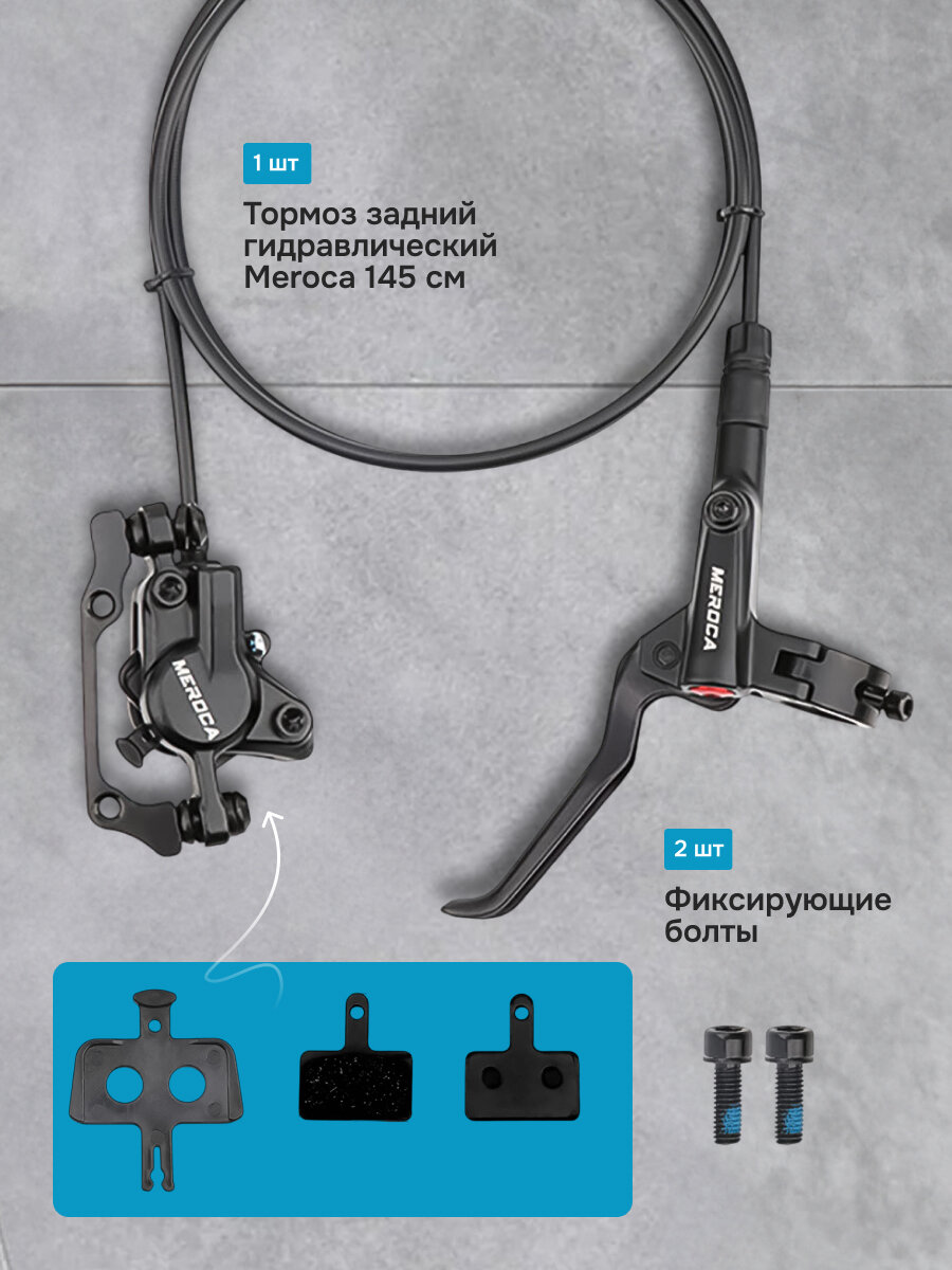 Тормоз задний гидравлический Meroca 140 см поставляется в комплекте с фиксирующими болтами и насадкой для крепления.
